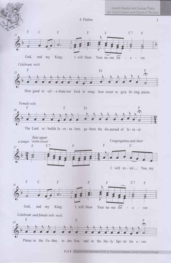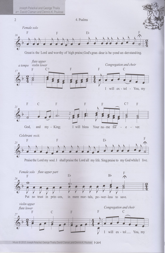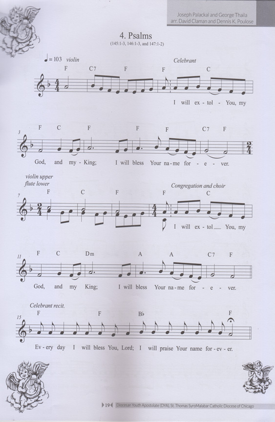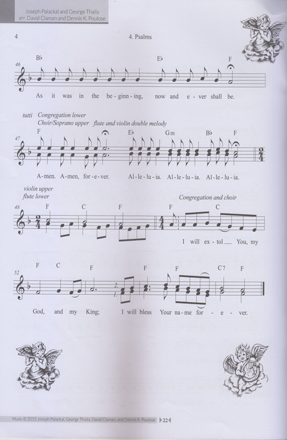The singing of a set of three or four palms follows the “Our Father.” The set of psalms, referred to in Syriac marwīzā, changes according to the liturgical season. The final psalm in the set is concluded with the Trinitarian doxology, "Glory be to the Father and to the Son and to the Holy Spirit,” and alleluia. The text in # 3 consists of psalms 145: 1-3, 146: 1-3, and 147: 1-2. The mood is one of exuberant joy. The melody of the refrain is set to 4/4 meter, and the verses are sung solo in a rhythmically free, recitative style. It may be noted that in the Chaldean liturgy the singing of psalms is treated as a separate unit within the introductory rites, and not, as in the Latin Mass, as а "response” to reading from the Old Testament.