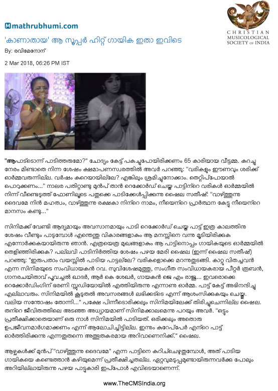 The song is now available in the CMSI Directory of Christian songs ( Ref Code .009-459)During the Recording of - Nee ente prarthana kettoo