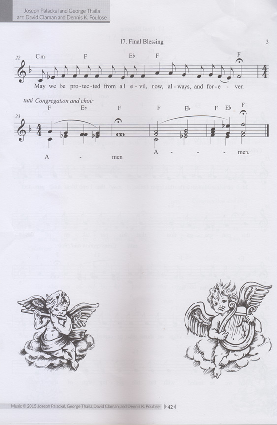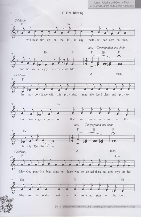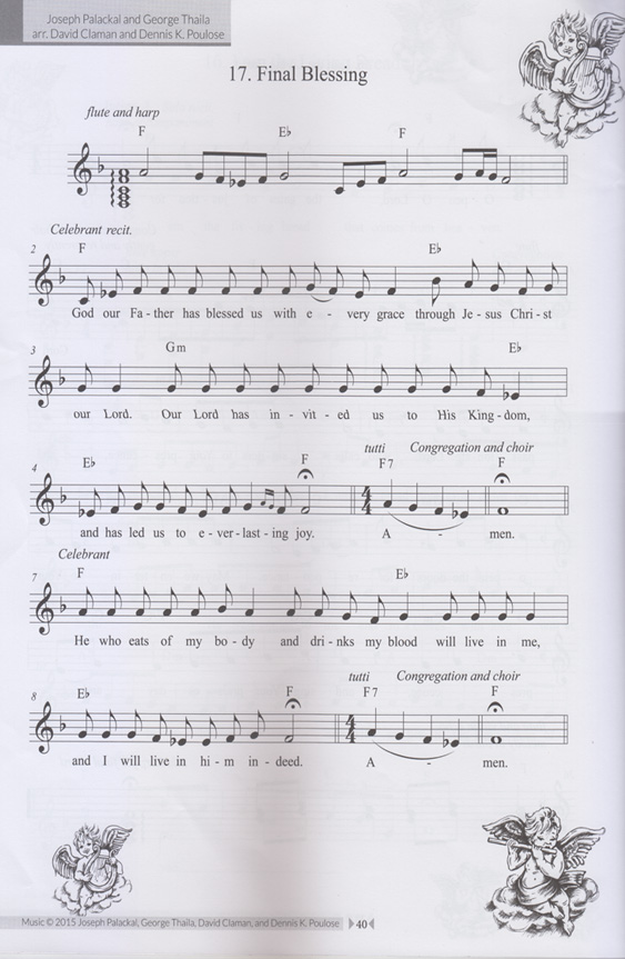 The concluding rite of Mass in the Chaldean liturgy is much more elaborate in comparison with that of the Lain rite. There are separate prayers of praise and thanksgiving for the congregation, deacon, and the celebrant: the prayers of the congregation and the celebrant vary according to the occasion. In the most solemn form of the Mass, these prayers are followed by the recitation of the solemn form of the "Our Father" with "thrice holy” and doxology. Thereafter, the celebrant sings the final blessing. The blessing included here is the one used on Sundays and feast days. It is set in recitative style in medium tempo, creating a sense of calm conclusion.