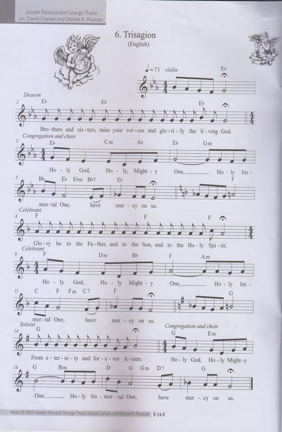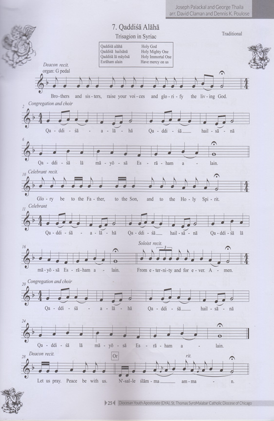 The liturgy of the word begins with Trisagion (Greek "thrice holy") "Holy God, holy mighty One, holy immortal One, have mercy on us. It is sung three times with three different incipits. The hymn originated in the Antiochene (West Syriac) tradition. It was first performed in 451 AD as the Council of Chalcedon (Pathikulangara 1998: 170-171). Because of its theological appeal other Eastern churches adopted the hymn into their liturgies. In the Latin rite, the hymn is sung during the Good Friday service. As in the case of the opening hymn, the Trisagion is sung here three times in three ascending pitch registers (Eb, F, & G). The liturgy prescribes the following performance practice: the deacon invites the faithful to raise their voices and praise the living God; the choir and the congregation sing the hymn; the celebrant, deacon, and the servers together repeat the hymn with the prefix “Glory be to the Father and to the Son, and to the Holy Spirit;” and finally, the choir and the congregation sing the hymn with the prefix “for ever and ever, amen.”
