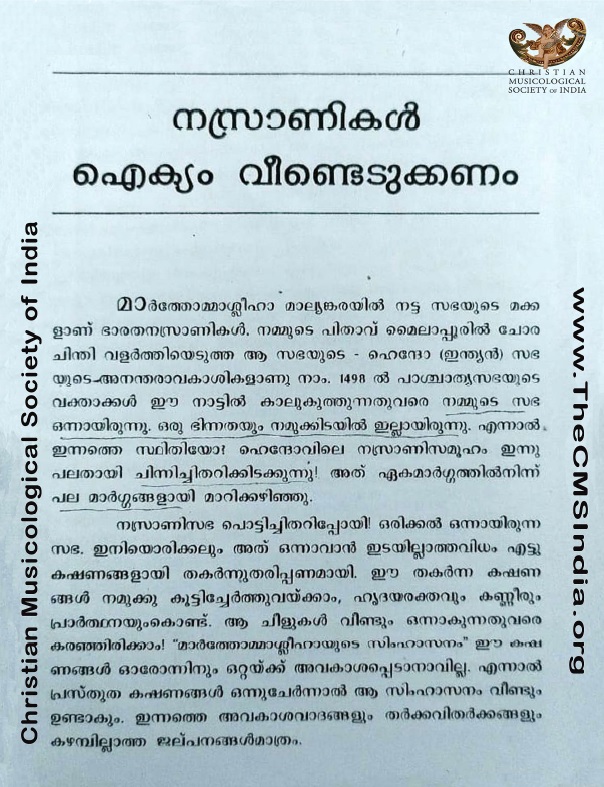 Keywords - Nasranikal Aykhyam Vendedukkanam, Konnamakkal Malpan, Nasranis must Reunite