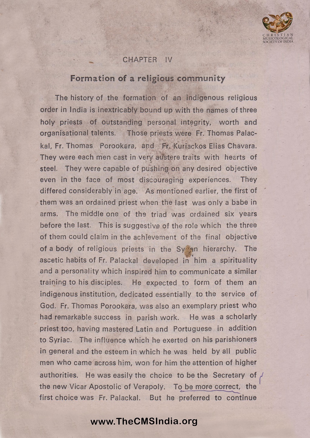 Christian Musicological Society of India is an international forum for interdisciplinary research, discussion, and dissemination of knowledge, on the music, art and dance of about thirty million Christians in India, who belong to a diverse set of communities and linguistic groups and follow a variety of liturgical traditions some of which date back to the early Christian era. Founded in 1999 by Dr. Joseph J. Palackal CMI, the Society hopes that such researches will draw attention to the lesser known aspects of India in connection with the rest of the world.