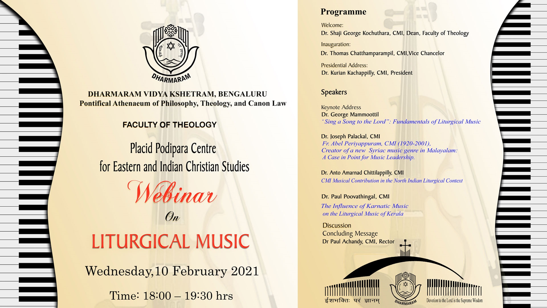 Keywords - Webinar on Liturgical Music, Zoom Webinar, Zoom, Dharmaram Vidya Kshetram Bengaluru, DVK Bengaluru, DVK Bangalore, Faculty of Theology- Placid Podipara Centre, Fr. Placid Podipara, Fundamentals of Liturgical Music, Fr. Abel Periyappuram, CMI (1920-2001), Fr. Abel CMI,CMI Musical Contribution in the North Indian, The Influence of Karnatic Music on the Liturgical Music of Kerala, Dr. Paul Poovathingal, CMI, Fr. Dr. M. P. George, Dr Joseph Palackal CMI, Dr. Anto Amarnad Chittilappilly, Influence of Karnatic Music in Christian Music, Christian Classical Music