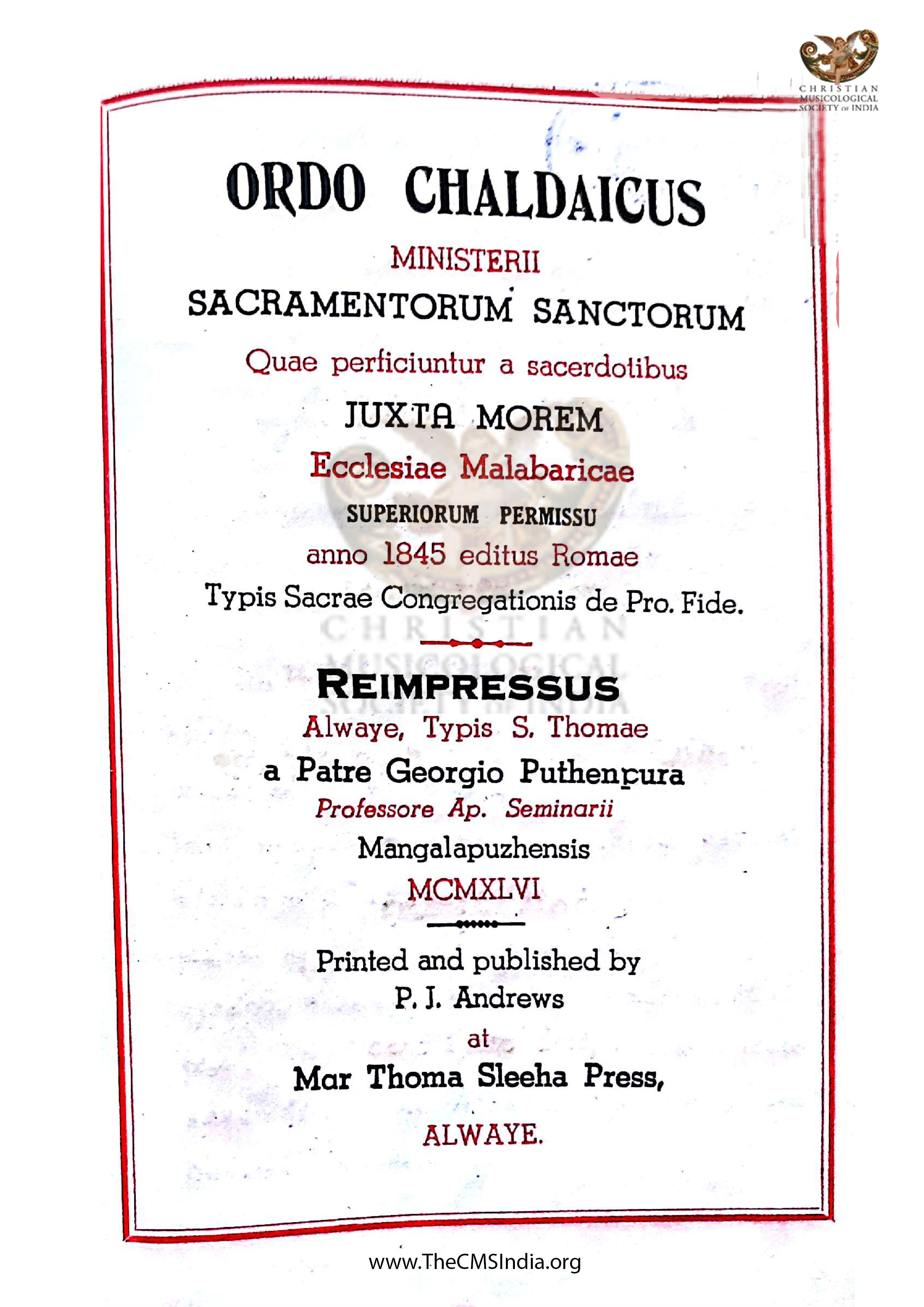 Keywords -Ordo Chaldaicus, P.J Andrews , Mar Thoma Sleeha Press Alwaye , Mar Thoma Sleeha Press, Franciscus Mehaseb Maronita , Fr. Dominicus Buttaoni , Joseph Canali Archiep Colossen .Vicesgerens,Augustine Kandathil, Archbishop, Ernakulam, Archbishop of Ernakulam, Augustine Kandathil, Fr.Thomas Moothedan
