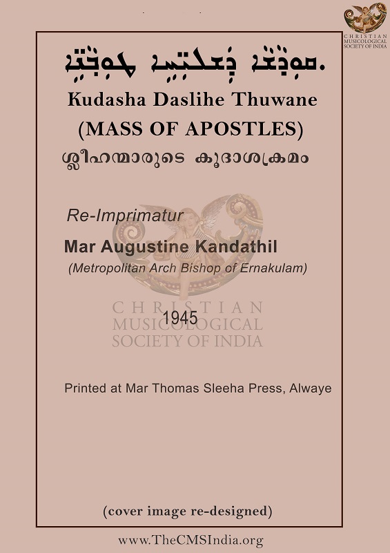 Keywords: #KudashaDasliheThuwane #MassOfApostles #Sleehanmarudekoodashakremam #MathewVadakel #Huthama #Thaksa #ReadingfortheFeastofSaints #PreparationfortheMass #TheordinaryoftheMass #ServerspartoftheMass #ThecommonofSaints #ReadingfortheresultofSaints #MarThomasSleehaPress #Alwaye #MarAugustineKandathil #MalpanMathewVadekal #HolyMassBook #AnaphoraofAddaiandMariHolyMassBook #FinalblessingofthefeastofblessedVirginMary #Syr MalabarChurch #StThomasChristians