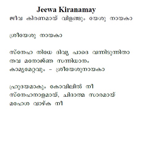 | Comments | This chant's story is embedded in the history of a liturgical movement that Dharmaram College in Bengaluru spearheaded from 1964 to 1979. The staff and students attempted to inculturate the Christian faith by devising an "Indian liturgy" in Malayalam. The movement was part of celebrating Indian theology in worship. Accordingly, the liturgical vocabulary, rituals, and Indian classical music became the medium. Fr. Cherian Kunianthodath, CMI wrote the text of "Jeewa Kiranamay Vilangum" to a melody in use in the Ramkrishna Ashram in Bengaluru. The song became a part of the thanksgiving meditation after Communion. The serene melody in the popular North Indian rag Darbari Kanada created a meditative mood. The song became popular among those who attended the "Indian liturgy." ..... Read More ByDr. Joseph J. Palackal,CMI New York 15 April 2021 |