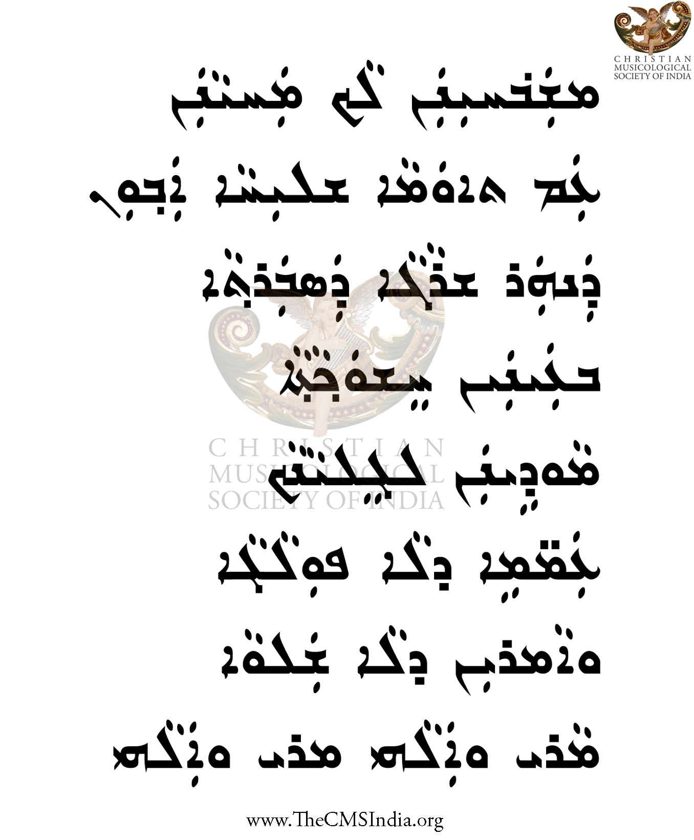 മ് ശബ് ഹീനൻ ലാക് മഹ് യാനൻ അം തോമാ ശ്ലീഹാ ആവൂൻ ദന്ഹർ ശ്രാഗാ ദസ് വർസാ ബ് ഐനൈൻ ഹെശോകാസാ മൗദേനൻ ല് ഗെല് യാനാക് അമ്മേ ദ് ലാ പൂലാഗാ വാമ് റീൻദ് ലാ ശൽവാ മാർ വാലാഹ് മാർ വാലാഹ് |
