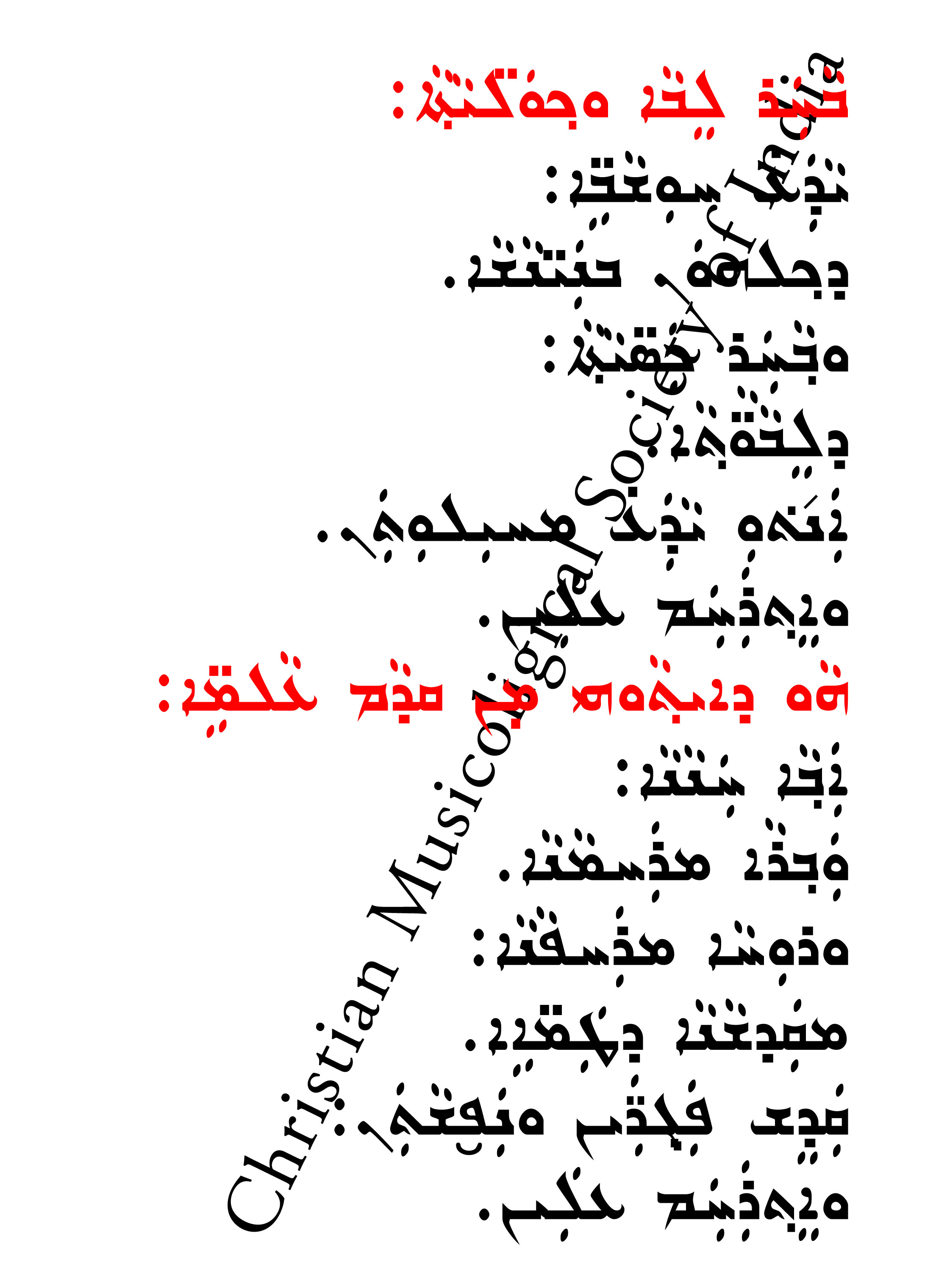 ബാഹർ ലെംബാ ഉകൊൽയാസാ യാദാ ഹുശാവേ: ദ്കൊൽഹോൻ ബ്നൈനാശാ . ഉവാഹർ കസ്യാസാ: ദ്ലെംബാവാസാ . അത്തു യാദാ മ്ഹീലൂത്തൻ . വെസ്റഹം എലയ്ൻ. ഹാവ് ദീസാവ് മിൻ ഖ്ദാം ആൽമേ: ആവാ ഹന്നാന: വവ്റാ മ്റഹമാനാ. ഉറൂഹാ മ്റഹ്പാനാ: മ്ഖദ്ശാനാ ദ്ത്തമ്ഏ. ഖന്ദെശ് പഗ്റൈൻ ഉനവ്ശാസൻ: വെസ്റഹം എലയ്ൻ. |