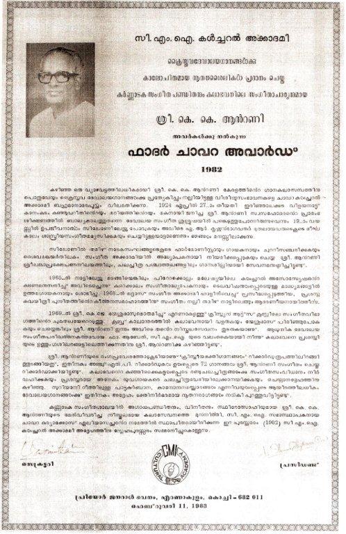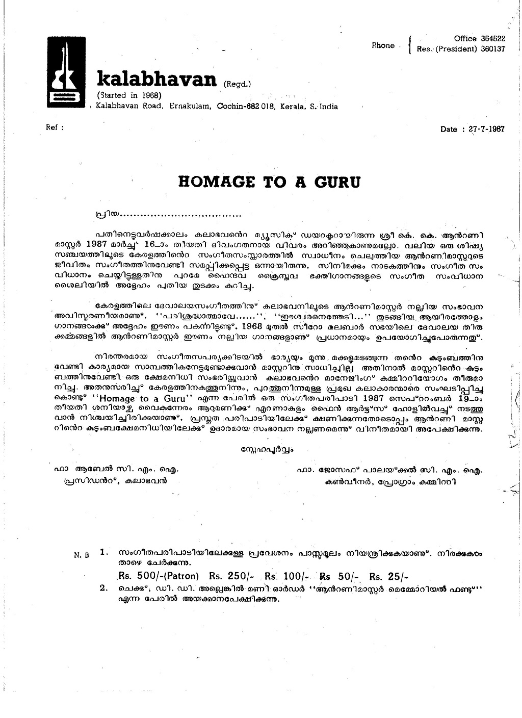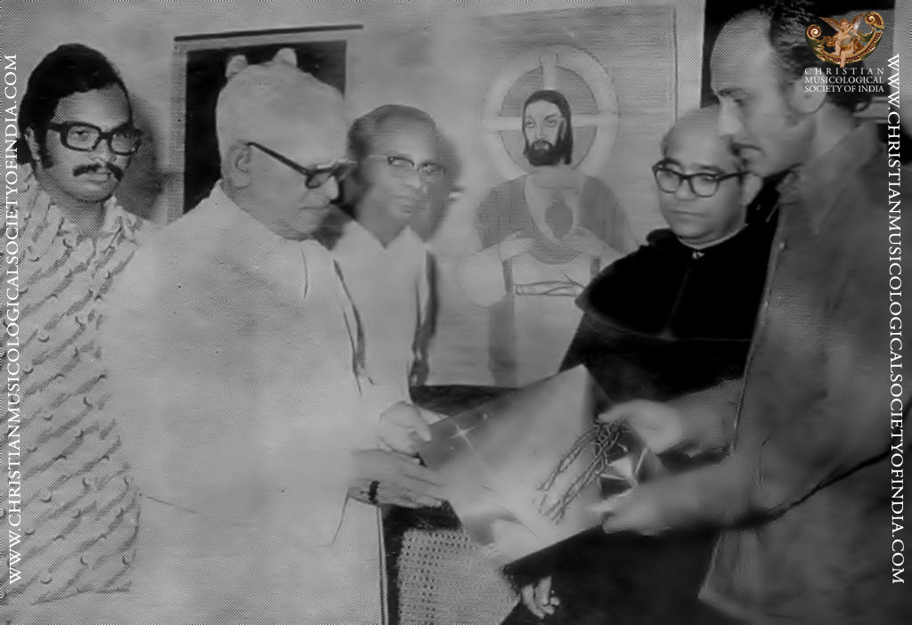 In 1969, Antony Master returned to Kerala. In the same year he met Fr. Abel Periyappuram, C. M. I. (1920-2001) at the Prior General’s House of the Carmelites of Mary Immaculate (C. M. I.), at Eranakulam. The meeting of two great minds changed not only their own lives, but also the history of Christian music in India. The two, along with Padmashri K. J. Yesudas (then an upcoming playback singer for Malayalam films) started the Christian Arts Club to promote Christian music. Soon, with the support of Joseph Cardinal Parecattil (1912-1987) and the Archdiocese of Eranakulam, the Club was registered with a secular name, Kalabhavan. For many years, promotion of Christian music continued to be one of the main activities of Kalabhavan, and Antony Master gave unreservedly his life and his talents for the cause. He remained teacher and music director of Kalabhavan until his death.