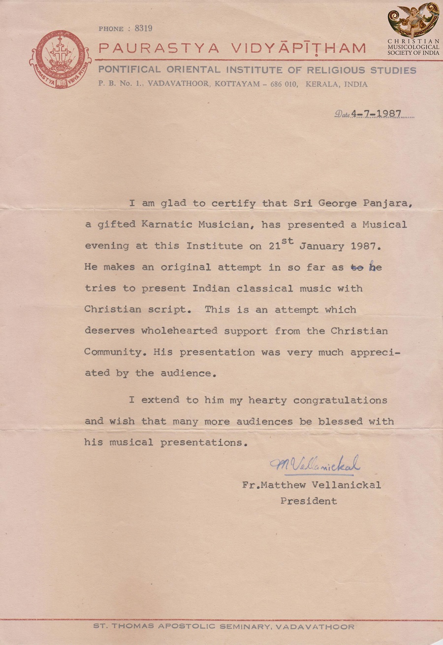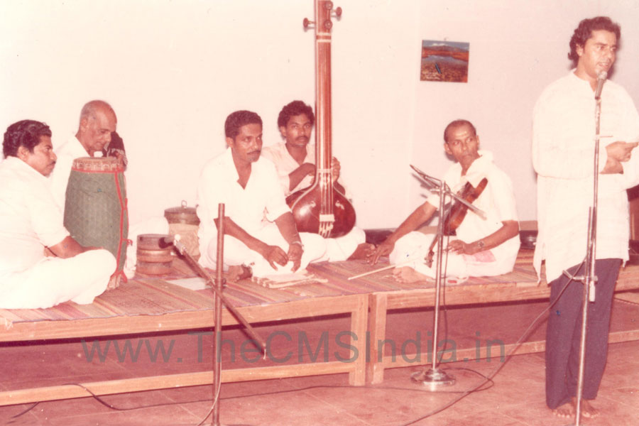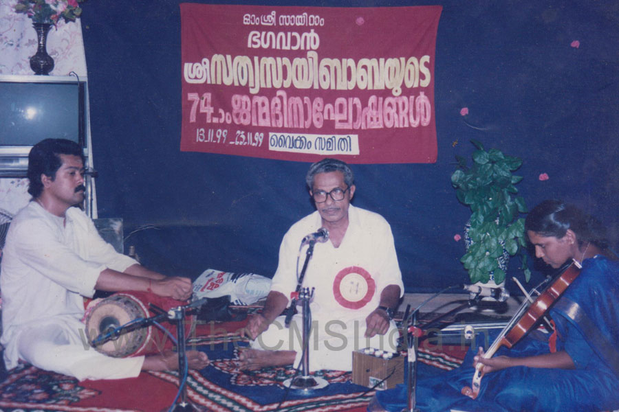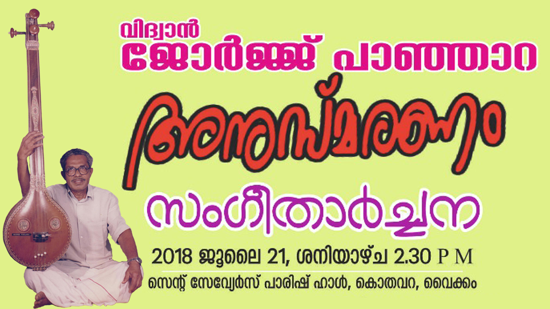 Panjara’s native place, Kothavara, is adjacent to the historic town of Vaikom. The most important institution in this town is the Shree Mahadeva temple which has a significant place in Indian political, social, and cultural histories. The main offering in this temple during the festival season, is music. Famous and aspiring Karnatic classical musicians come here and perform their art as an offering to Lord Shiva, the presiding deity of the temple. Thus, people in the vicinity have the fortune to listen to great performers. Besides, for many years, the temple used to play recordings of classically based Hindu devotional songs through public address system in the early mornings. This is the environment in which Panjara grew up, and his mind and body resonated with the music that was in the air. Panjara decided to learn Karnatic music from Maestro Vaikkom Balakrishnan Nair, who was associated with the Vaikom temple. After mastering the art of classical music, Panjara redirected his life journey as a performing artist. Similar to the great composers in the Bhakti tradition, Panjara composed Christian devotional songs in Malayalam and performed them in a concert format.