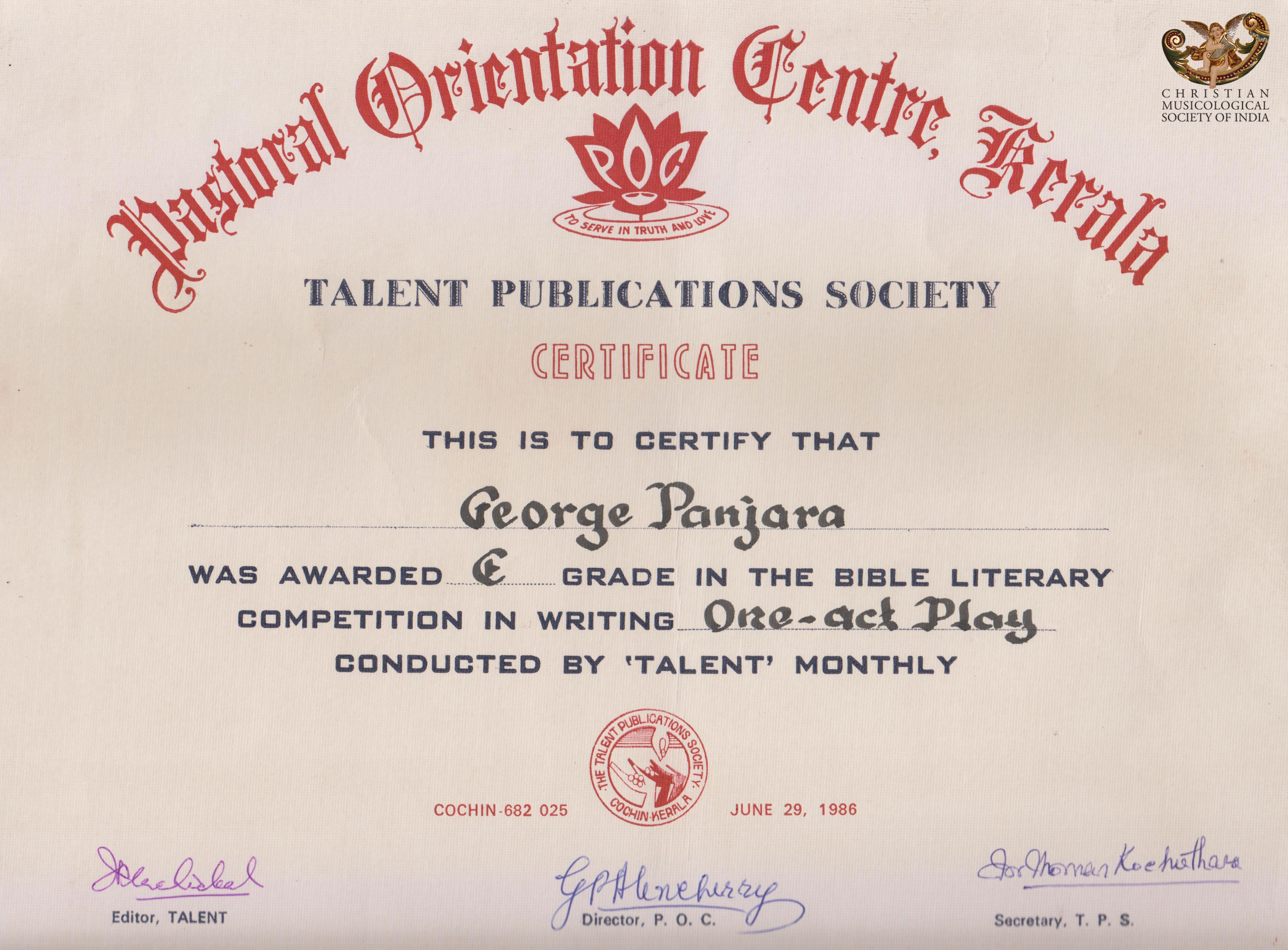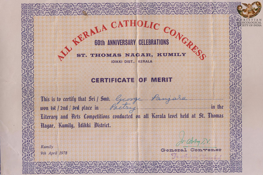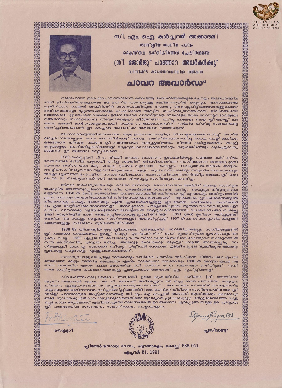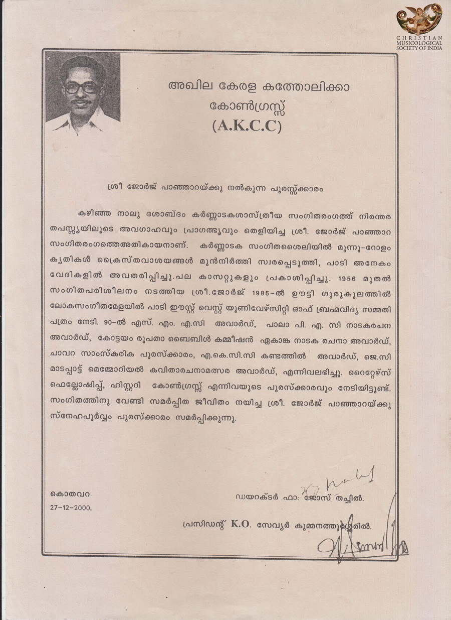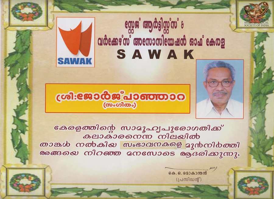 George Panjara was gifted with supple vocal cords, a solid, baritone voice with a range that extended beyond two and a half octaves; he also had a brilliant mind that absorbed and processed information, musical or otherwise, that came on his way from varied sources. He educated himself on the nuances of the Malayalam language by reading books. This self-learning gave him courage to venture into various literary genres as poetry, drama, short stories, and novel. By 2009, Panjara had already 300 compositions with Christian themes to his credit. This is an extra ordinary corpus of Christian literature that he has bequeathed to Kerala and Christianity. He also had a vivid imagination creating visual images through word painting.
