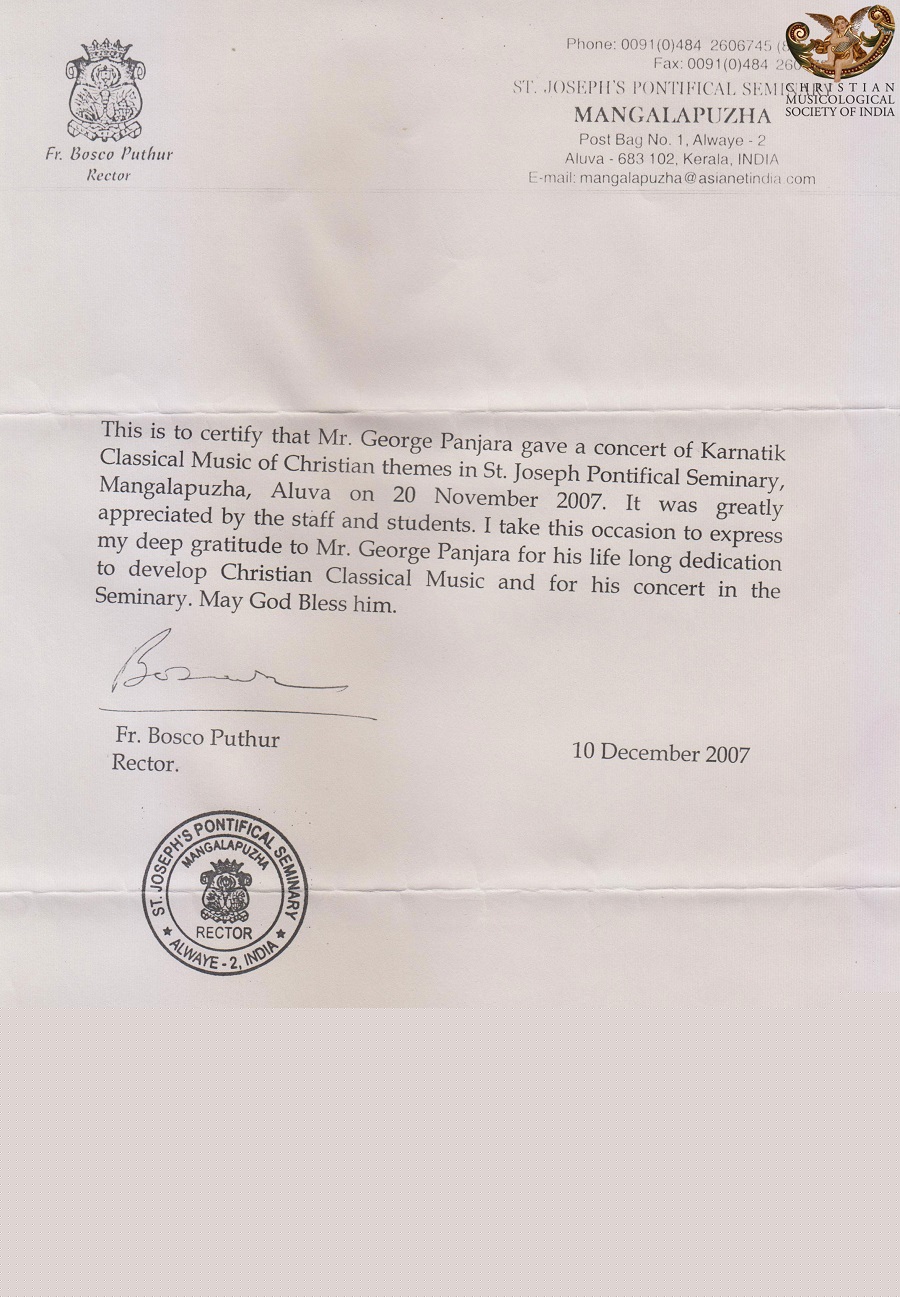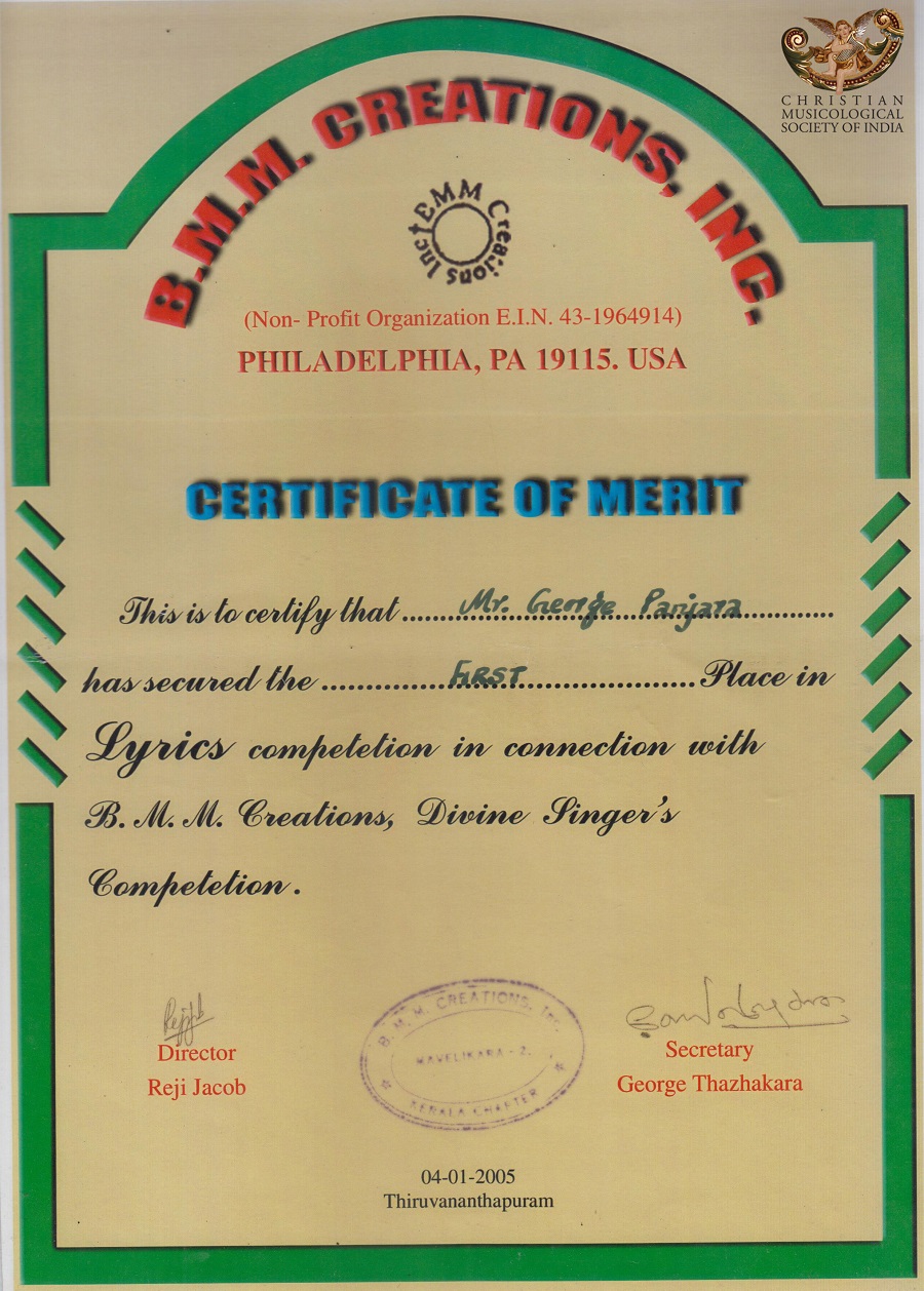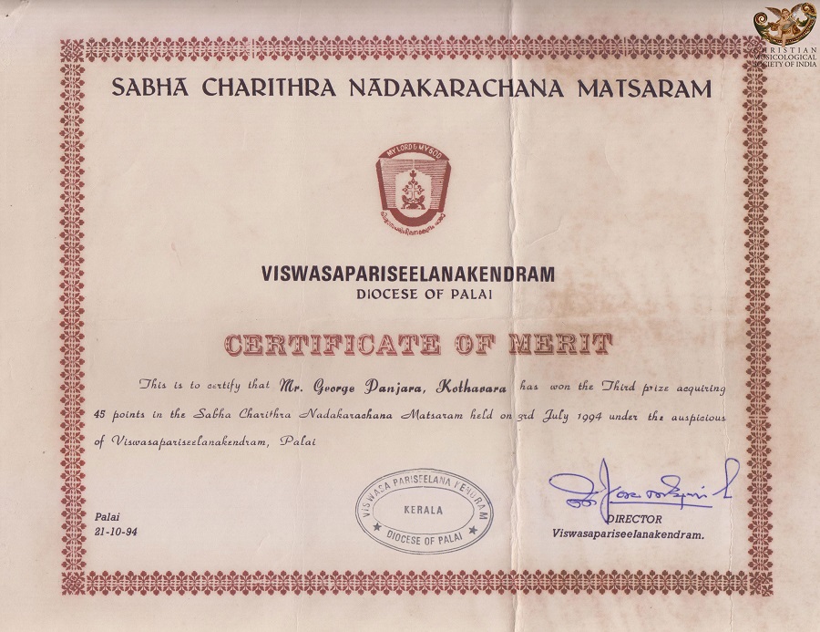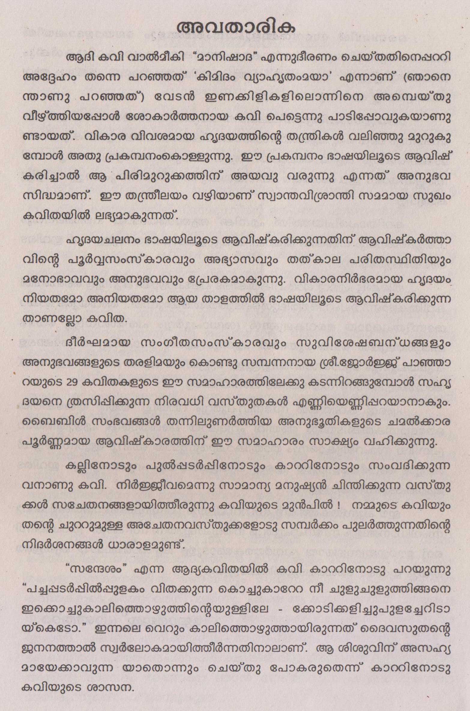 George Panjara was gifted with supple vocal cords, a solid, baritone voice with a range that extended beyond two and a half octaves; he also had a brilliant mind that absorbed and processed information, musical or otherwise, that came on his way from varied sources. He educated himself on the nuances of the Malayalam language by reading books. This self-learning gave him courage to venture into various literary genres as poetry, drama, short stories, and novel. By 2009, Panjara had already 300 compositions with Christian themes to his credit. This is an extra ordinary corpus of Christian literature that he has bequeathed to Kerala and Christianity. He also had a vivid imagination creating visual images through word painting.