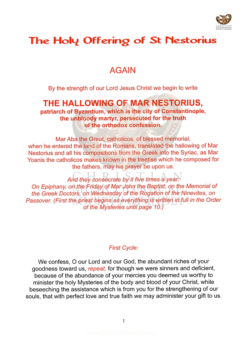 This book was published by Assyrian Church of the East. This is the ANAPHORA of St. Nestorius which is considered as the third ANAPHORA of the East Syriac tradition. The Holy Offering of the Nestorius again by the strength of our Lord Jesus we begin to write the Hallowing of Nestorius,partriarch of Byzantium, which is a city of Constantinople, the unbloody martyr, persecuted for the truth of the orthodox confession.