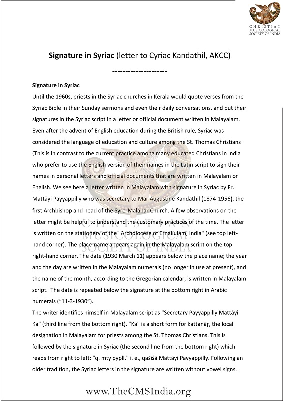 Until the 1960s, priests in the Syriac churches in Kerala would quote verses from the Syriac Bible in their Sunday sermons and even their daily conversations, and put their signatures in the Syriac script in a letter or official document written in Malayalam. Even after the advent of English education during the British rule, Syriac was considered the language of education and culture among the St. Thomas Christians (This is in contrast to the current practice among many educated Christians in India who prefer to use the English version of their names in the Latin script to sign their names in personal letters and official documents that are written in Malayalam or English). We see here a letter written in Malayalam with signature in Syriac by Fr. Mattāyi Payyappilly who was secretary to Mar Augustine Kandathil (1874-1956), the first Archbishop and head of the Syro-Malabar Church. A few observations on the letter might be helpful to understand the customary practices of the time. The letter is written on the stationery of the "Archdiocese of Ernakulam, India" (see top left-hand corner). The place-name appears again in the Malayalam script on the top right-hand corner. The date (1930 March 11) appears below the place name; the year and the day are written in the Malayalam numerals (no longer in use at present), and the name of the month, according to the Gregorian calendar, is written in Malayalam script. The date is repeated below the signature at the bottom right in Arabic numerals (“11-3-1930”).
