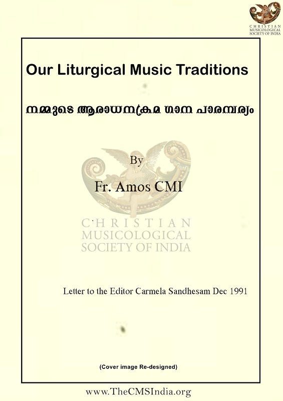 Letter to the editor of Carmela Sandesham December 1991 (English Translation) This letter from Fr. Amos CMI to the editor of Carmela Sandesham (for private circulations among members of the Carmelites of Mary Immaculate worldwide) is valuable to music scholars because it draws attention to the Syriac melodies that were prevalent within the CMI communities. It also points to the differences between the melodies of the same chants among the diocesan priests and the CMI priests.